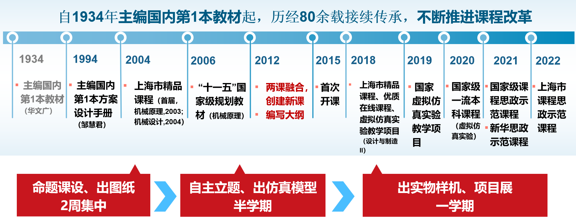 2015-现在:引入机构和结构贯通、机和电融合的系统观,融合“机械原理”“机械设计”创建了“设计与制造Ⅱ”新课程,开发数字化教学资源,探索基于实物样机开发的项目式教学新方法,夯实学生的专业基础并突出动手实践能力。课程入选了首届国家级一流本科课程(虚拟仿真实验,2020,课程配套实验)、首届教育部课程思政示范课程(2021)、新华思政示范课程(2021)、教育部机械原理课程群虚拟教研室名师示范课程(2022),上海市重点课程(2017)、精品课程(2018)、优质在线课程(2019)、一流本科课程(2021)、课程思政示范课程(2022)。