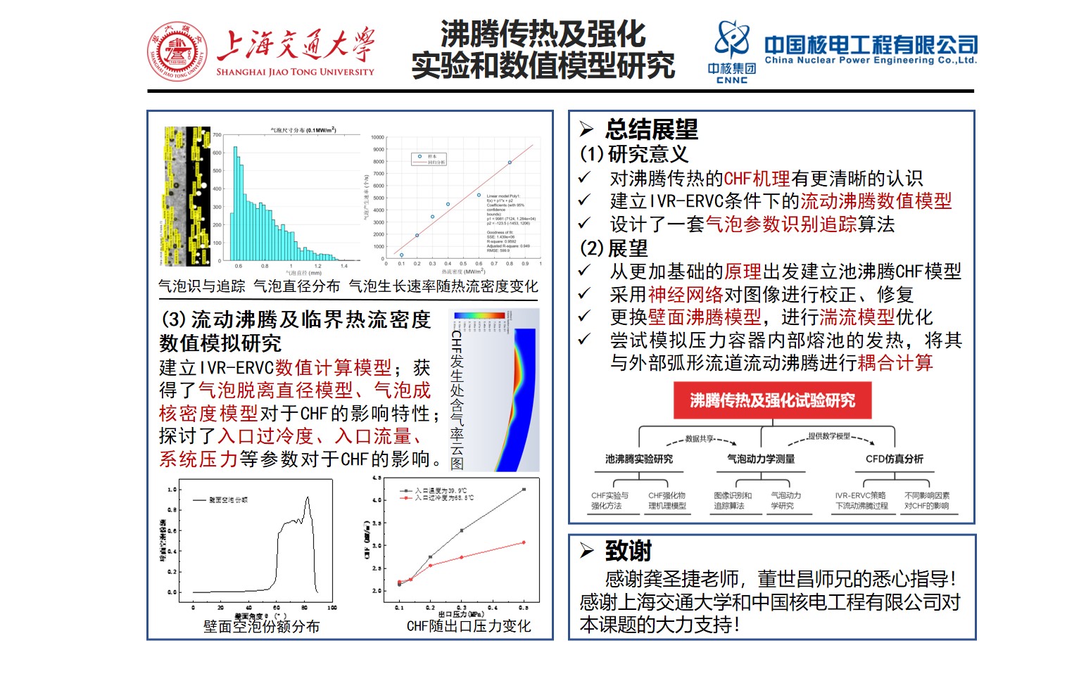 在沸腾传热气泡识别及气泡动力学研究方面,设计了一套气泡参数识别追踪算法,能够实现对气泡直径的统计和位置追踪。研究发现,过冷池沸腾气泡有两种行为模式;气泡产生速率与热流密度有线性关系;在常压过冷池沸腾中,壁面过热度不是气泡脱离的主导因素。