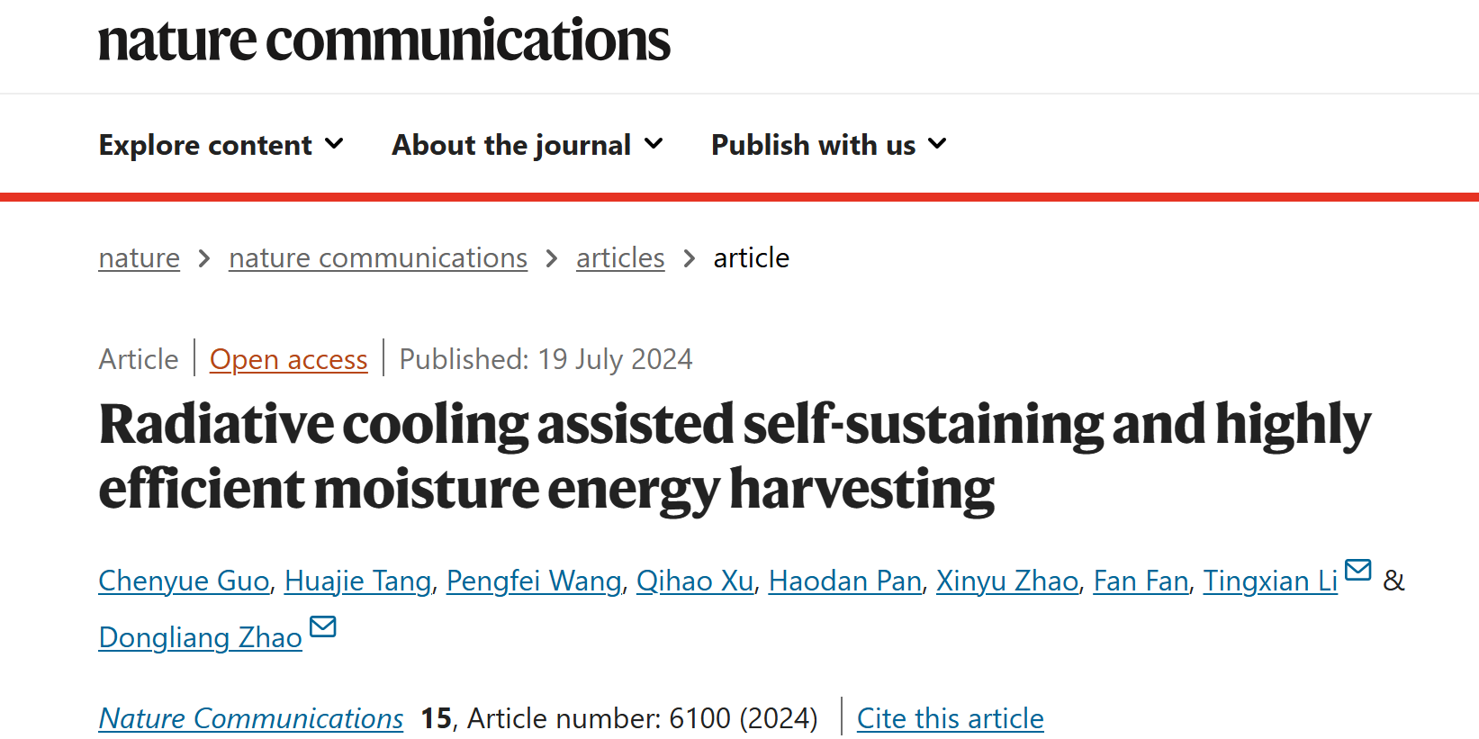 近日,机械与动力工程学院制冷与低温工程研究所ITEWA团队与东南大学团队合作在国际期刊Nature Communications发表了题为 “Radiative cooling assisted self-sustaining and highly efficient moisture energy harvesting” 的研究论文。该工作针对自然环境波动严重影响湿气发电稳定输出的难题,提出了一种辐射致冷辅助的高效稳定湿气发电新策略,构建了兼具“水分吸附-湿气发电-辐射致冷”多功能的双层聚合物凝胶,为实现波动自然环境中高效长时湿气发电提供了新思路。我院博士生王鹏飞和东南大学研究生郭晨玥、汤华杰为论文共同第一作者,李廷贤研究员和东南大学赵东亮教授为共同通讯作者,王如竹教授对该工作给予了指导和建议。