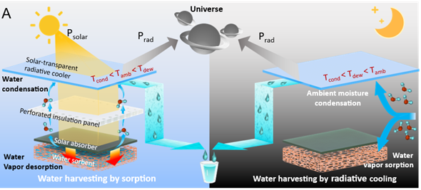 为了满足干旱地区的用水需求,开发新的水源极为重要。大气中蕴藏着丰富的水蒸气,其含量约为全球每年消耗水量的3.4倍,基于水蒸气吸附的大气水收集技术(S-AWH)近年来受到广泛关注,利用吸附材料和空气取水设备可以从空气中攫取水分,实现随时随地饮用水生产。然而,吸附式空气取水技术面临着高能耗和低产水量的瓶颈。为此,论文提出了一种耦合利用太阳能光热和全天辐射致冷实现全天高效空气取水新策略。为了构建紧凑高效的空气取水装置,论文采用透射型辐射冷却膜(TRC)允许太阳光透过辐射致冷膜,实现了同一占地面积下的顶部日间辐射致冷与底部光热转化集热。白天运行时,阳光透过TRC膜加热吸附材料驱动水蒸气释放,释放的水蒸气在TRC膜表面快速凝结集水。夜晚运行时,吸附材料从空气中捕获水蒸气,同时周围空气中高湿度的水蒸气在TRC膜上凝结,实现夜间辐射致冷驱动的直接产生水。