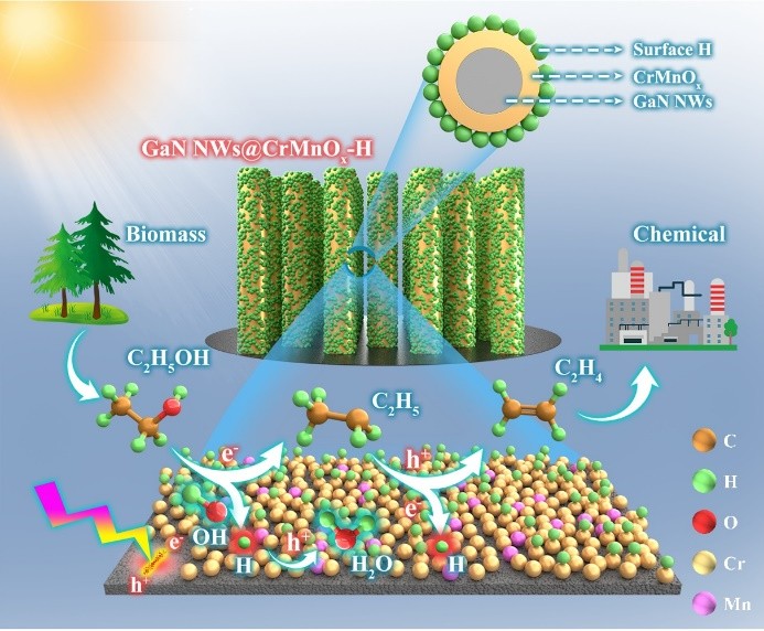 近日,新能源动力研究所周宝文副教授在Nature Communications上发表了题为“Surface-Hydrogenated CrMnOx Coupled with GaN Nanowires for Light-Driven Bioethanol Dehydration to Ethylene”的研究论文,展示了一种新颖的表面氢化的光催化纳米架构,利用阳光驱动生物乙醇脱水生成碳中性乙烯。新能源动力研究所/华中师范大学博士生王舟舟、北京大学叶昊天、新能源动力研究所博士生李亦昕为论文共同第一作者,周宝文副教授、北京大学王新强教授、华中师范大学余颖教授、新加坡国立大学欧鹏飞助理教授为共同通讯作者。