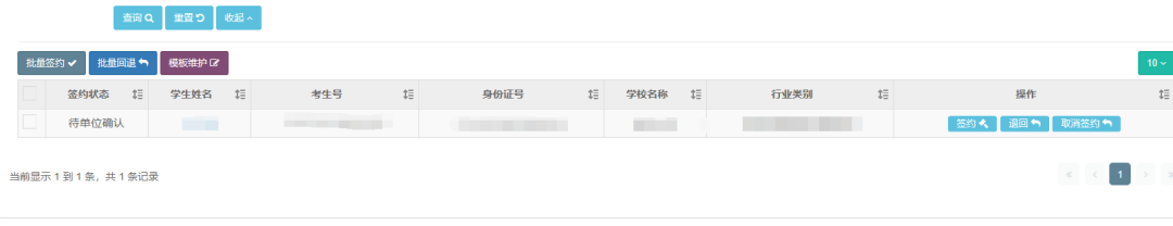 4、学生登陆系统,检查协议内容无误后,点击确认签约,此时状态为待学校确认,可以点击“协议书打印”,下载协议书word版,打印前请仔细确认信息是否无误。