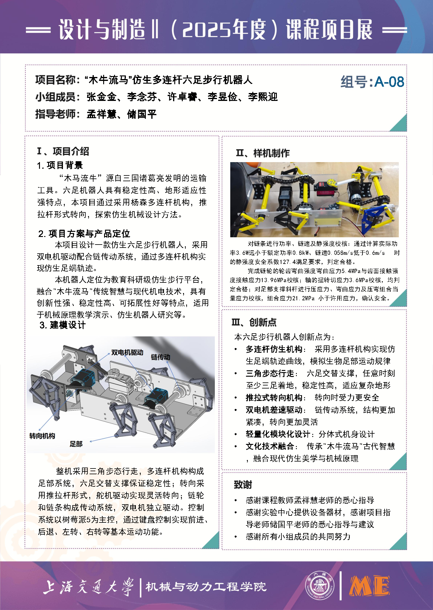 本项目以三国时期"木牛流马"为设计灵感,研制了一款仿生式多连杆六足步行机器人。该机器人采用双电机驱动、链传动方式,通过多连杆机构实现仿生足端轨迹,运用三角步态保证运动稳定性,并设计推拉杆式转向机构实现方向控制。整机融合了仿生学原理与机械设计方法,兼具功能性与美学特征。