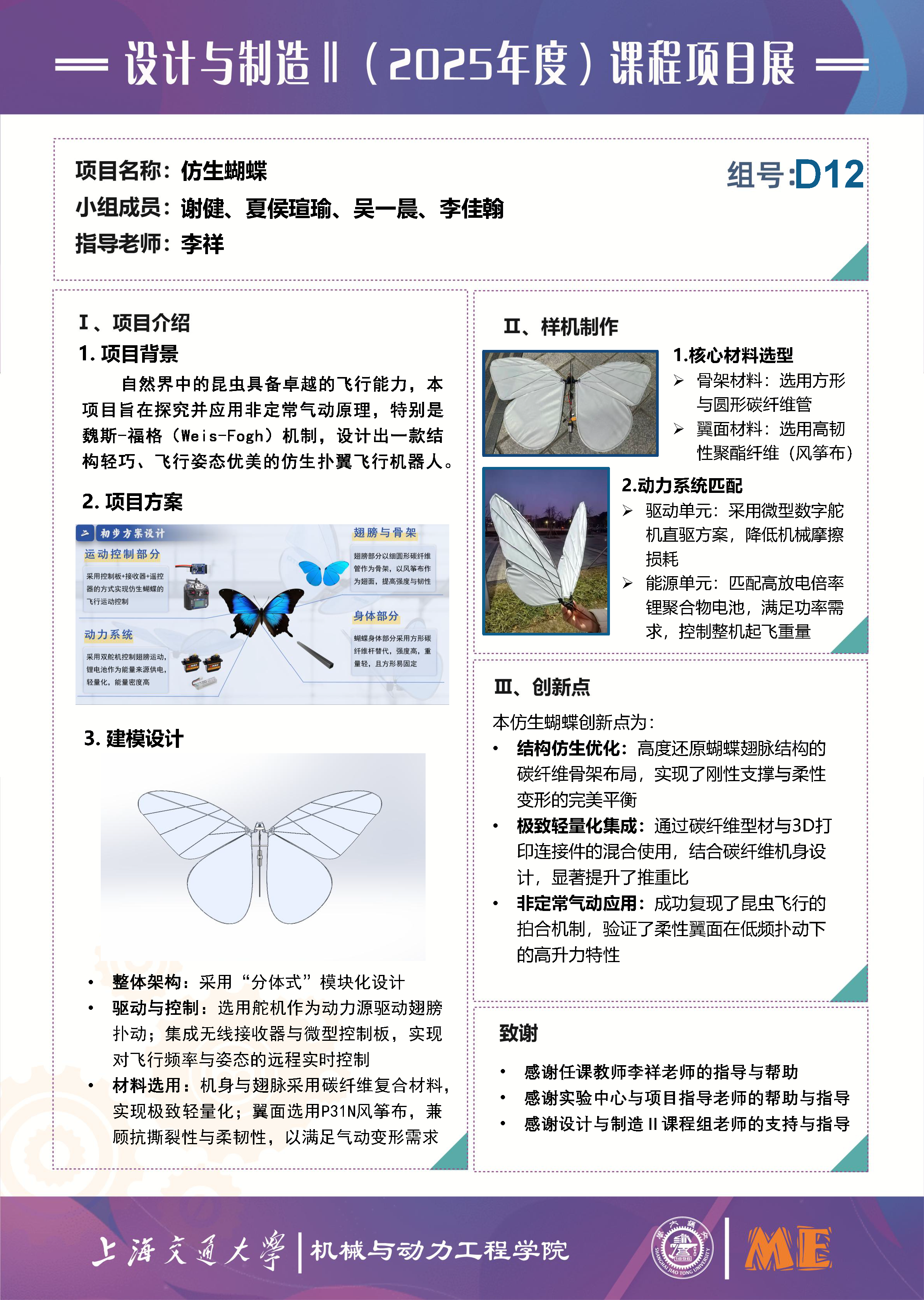 1. 课程项目要求:本项目作为课程实践项目,核心要求是结合课程所学的设计与制造知识,完成仿生蝴蝶的全流程设计、制作与验证,实现理论知识与工程实践的深度融合,提升团队的工程设计与项目协作能力。