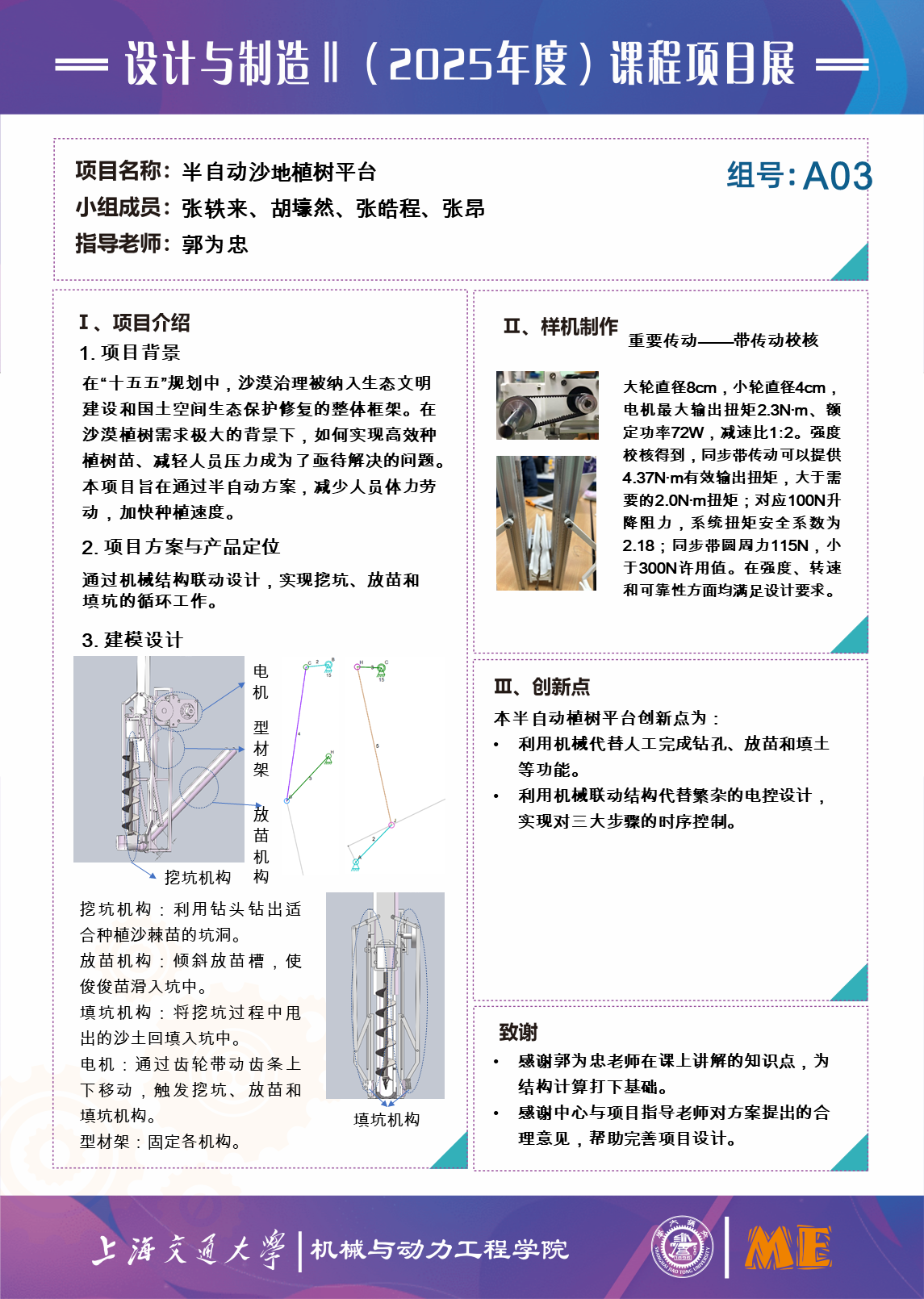 针对沙地种植俊俊苗的任务,设计并制造一款可循环作业的半自动沙地植树平台,完成挖坑、放苗和填坑三个过程。