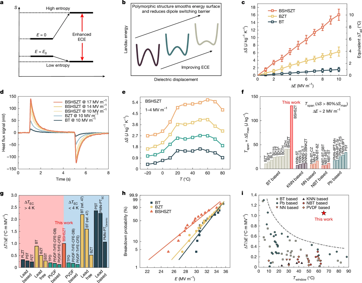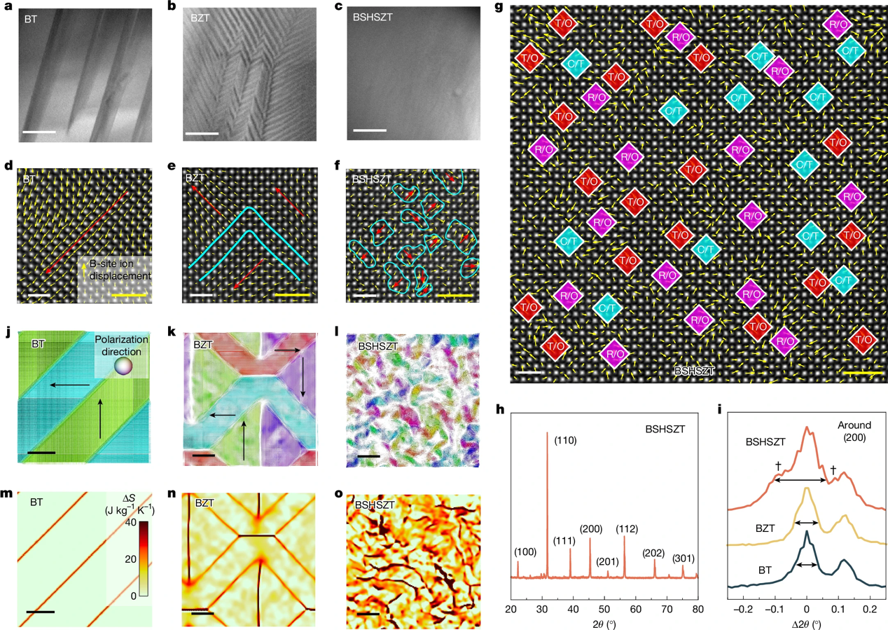Compared to more conventional polar structures such as barium titanate (BT, BaTiO3) and barium zirconate titanate (BZT, BaZr0.2Ti0.8O3), the high-polar-entropy ceramic (BSHSZT) exhibited a stronger electrocaloric effect and a broader operating temperature range. Under a 10 MV m⁻¹ electric field, the material of the high-polar-entropy oxide exhibited a tenfold increase in entropy change (~15 J kg⁻¹ K⁻¹), along with a working temperature range spanning over 60 °C near room temperature (Fig. 1). This high-polar-entropy oxide features an ultra-fine, multiphase-coexisting lattice structure, high breakdown field strength, and stable cycling performance exceeding 1 million cycles.