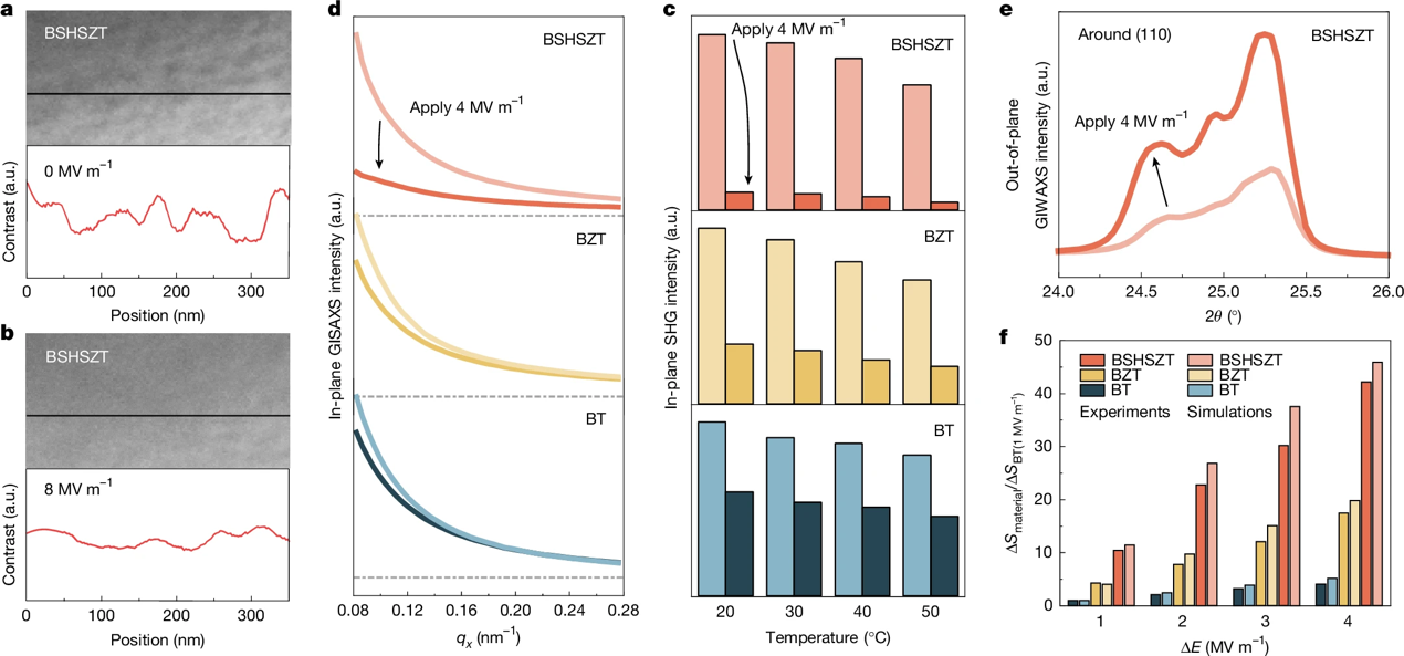 This high-polar-entropy strategy for inorganic materials effectively increases the electric-field-induced entropy change while reducing the energy barrier for phase transitions. The team further characterized the evolution of polar structures in inorganic ferroelectric ceramics under an in-situ electric field. TEM images showed that the disordered polar clusters in BSHSZT more readily undergo domain merging and polarization flipping under an electric field. Additionally, grazing-incidence small-angle X-ray scattering (GISAXS) and second-harmonic generation (SHG) measurements showed a greater signal reduction in BSHSZT than in BT or BZT under the same conditions, confirming its lower polarization switching barrier (Fig. 3).