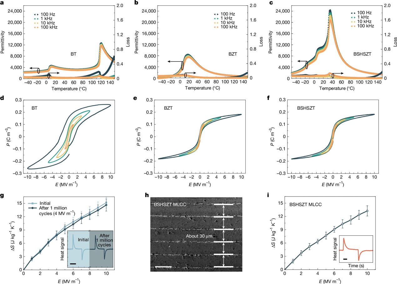 Fig. 4. Dielectric properties and cross-scale fabrication of multilayer electrocaloric refrigerants.