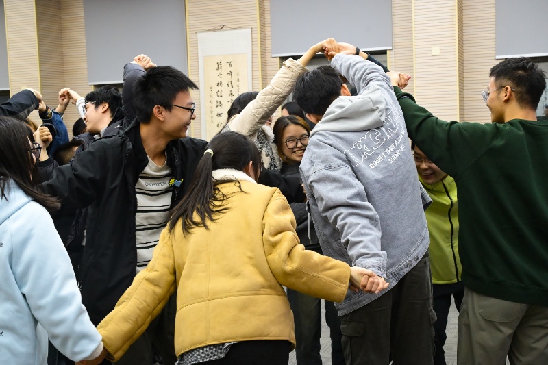 团体活动中,胡文婷组织开展“大风吹”、“最快排队”等热身游戏,现场气氛迅速升温。在随后的“人体多米诺”活动中,同学们围圈而坐,彼此支撑,在默契配合中成功完成旋转挑战,将现场气氛推向高潮。