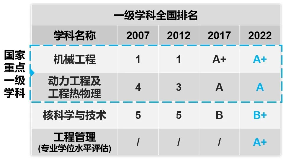 在全国学科评估中,机械工程学科连续四次位列首位或A+,动力工程及工程热物理学科获评A档;2024年,机械工程学科在QS世界大学学科排名中名列第21名。