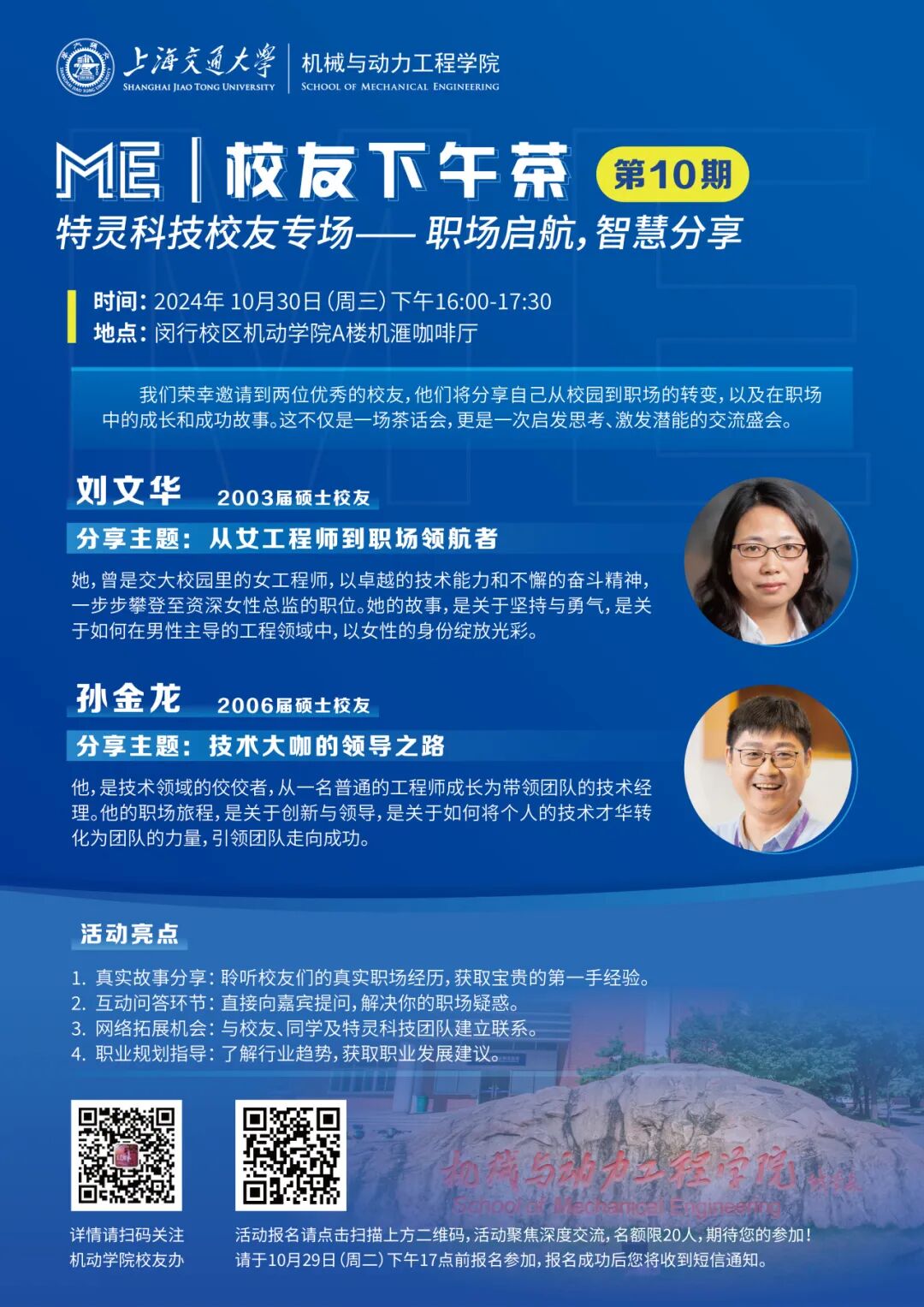 “ME丨校友下午茶”活动是机动学院校友办搭建的优秀校友与在校学生“面对面”沟通平台,将优秀热忱的校友请进校园,通过分享会的形式与在校学生开展主题交流,发挥校友资源育人功能。