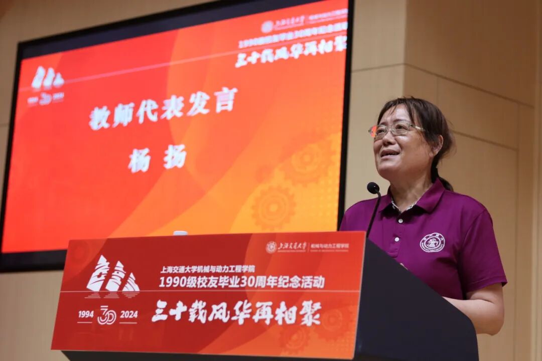 教师代表杨扬回顾了在学院工作的经历,讲述了校友们在学校学习、生活的往事,引发校友的共鸣。她用献血和劳动的故事,展现了交大师生间的深厚情谊,和交大人踏实肯干、不慕虚名的美好品德,并号召校友们作为机动人爱祖国、爱学校、爱学院,关心和支持学院发展。