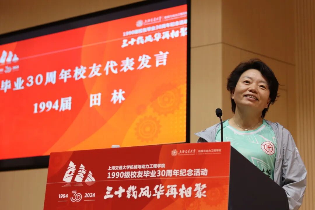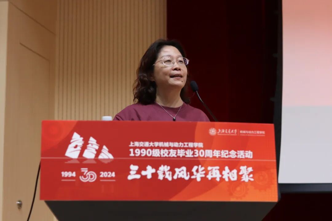 6系校友代表胡薇介绍了自己的求学和工作经历。作为毕业后留校工作的校友,她见证了30年来学院的发展壮大,并为学院的发展成绩感到自豪。她认为学院的进步离不开一代代机动人的努力,并祝愿学院继往开来、更上一层楼。