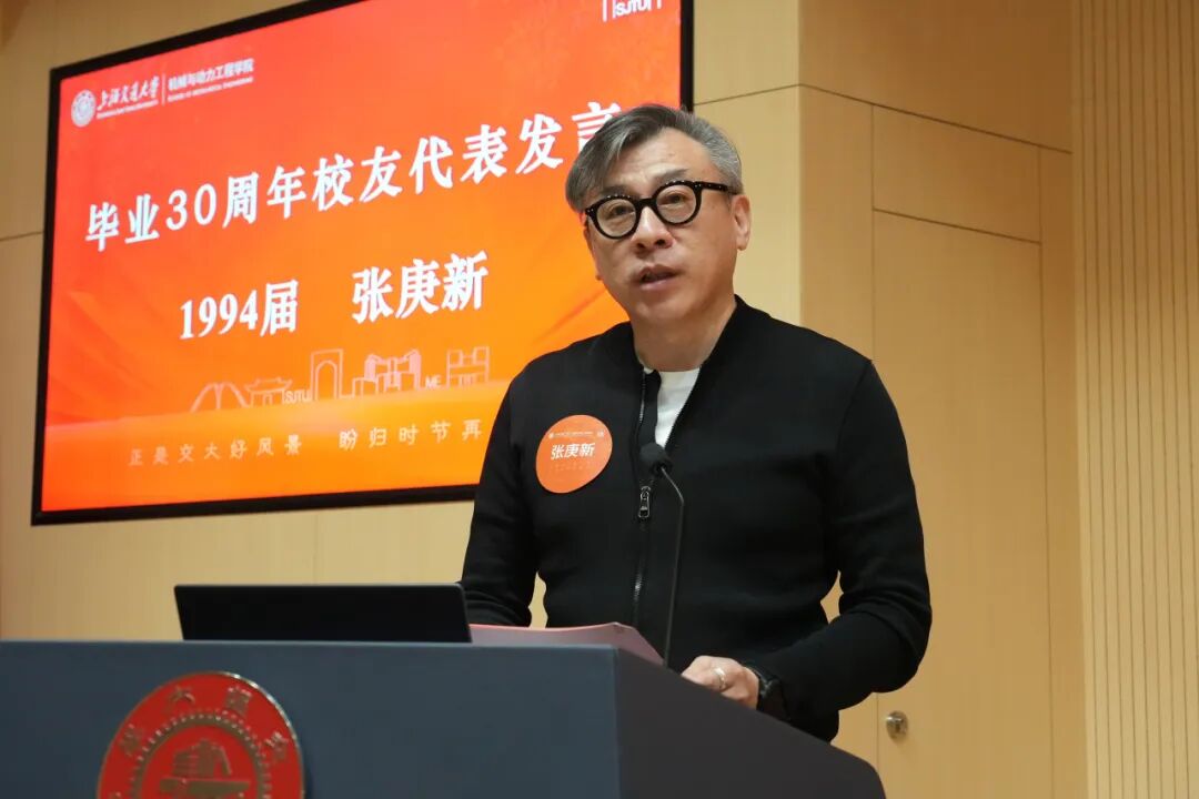 1994届校友张庚新作为毕业30周年校友代表,分享了求学经历和职业发展,表达了对母校的感激之情。他认为在母校的求学经历不仅学会了专业知识,还培养了如何用智慧和勇气探索未知的世界,让自己学会了保持独立思考、坚定初心和信念。他希望校友们能将这份感恩之心转化为前进动力,不断追求卓越,为社会发展做出更大的贡献,同时祝愿学院再续华章、再创辉煌。