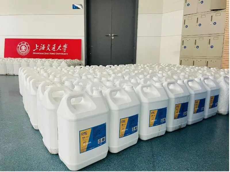 2014届制冷及低温工程专业博士校友颜健看到新闻后,立即想到大面积消杀还需要消毒液,便在第一时间联系母校和学院,不到24小时的无缝对接,4月25日下午,满载着校友浓浓关爱的200桶10升的次氯酸消毒液送达母校闵行校区,颜健校友携公司研维科技给消杀机器人配足了“弹药”。