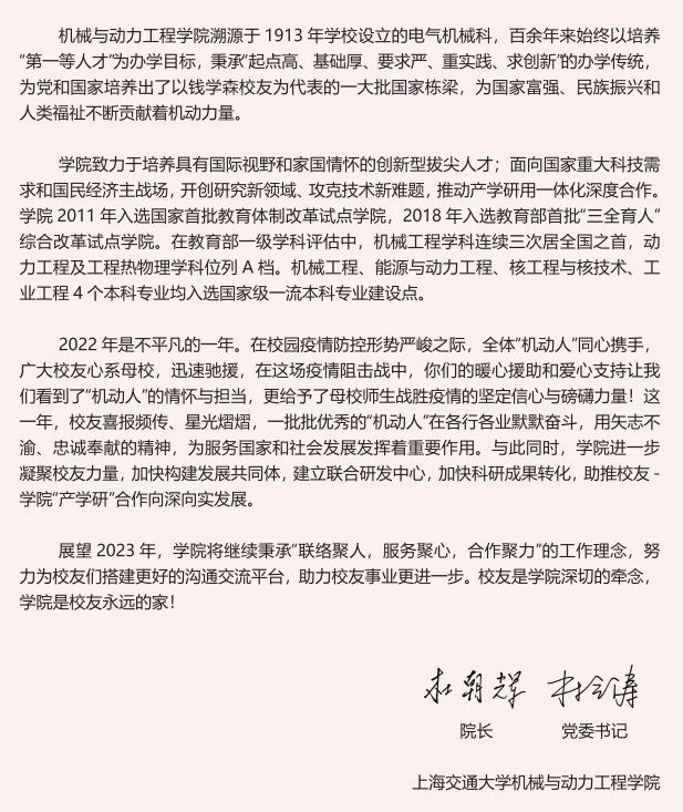 “冯桐笙奖学金”用于奖励在机械与动力工程学院机械工程专业、交大密西根学院就读的深具社会责任感和家国情怀的优秀本科学生。捐赠人冯庆先生表示,在祖父百年诞辰之际,以设奖助学这种方式来传承和纪念他炽热的家国情怀和教育厚望,是一件非常有意义的事。期待在这份奖学金助力下,学子们为国家建设和科技创新而努力,像前辈一样心系祖国,服务社会。