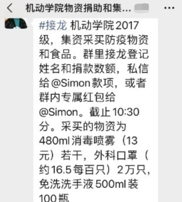 在众多捐赠的院友中,有这样一批校友——2017级研究生,他们怀着对母院深深的眷念,毕业不到两年,在得知消息的第一时间,就建立了物资捐助和集资采买的微信群,直到深夜还在竭尽所能寻找最快速的采购渠道,并于11日下午第一批物资到达学院,这就是“最年轻校友的抗疫速度”。