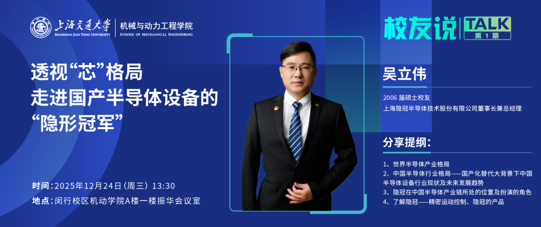 2025年12月24日,机械与动力工程学院 “校友说·TALK”第1期活动特邀学院2006届硕士校友、上海隐冠半导体技术股份有限公司董事长兼总经理吴立伟,以透视“芯”格局,走进国产半导体设备的“隐形冠军”为题,聚焦全球半导体产业格局与国产装备的机遇挑战。